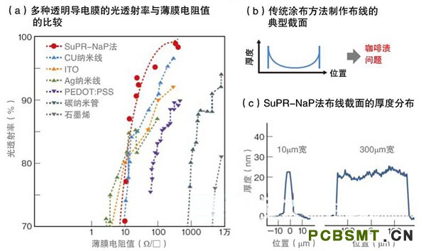 (a)SuPR-NaP法與現(xiàn)在的透明導(dǎo)電膜的光透射率、薄膜電阻值的比較。越靠近左上方,透明導(dǎo)電膜的性能越高。SuPR-NaP法在薄膜電阻率為20Ω/□時(shí),光透射率高達(dá)93%。(b)使用以往的涂敷方法,會出現(xiàn)布線等的邊緣較厚的“咖啡漬問題”。(c)用SuPR-NaP法加工任何布線寬度,布線的厚度都基本固定。