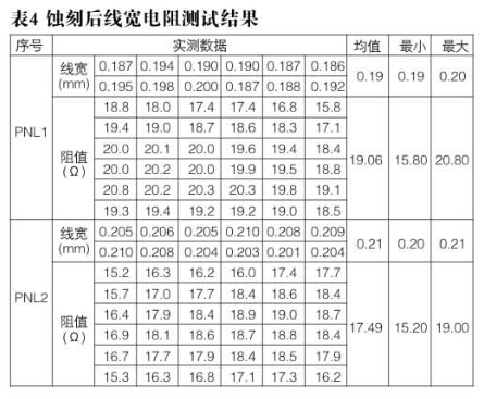 測試板2PNL,蝕刻得到PNL1線寬均值0.19mm,實測相應(yīng)阻值在15.8到19Ω;PNL2線寬均值0.21mm,實測相應(yīng)阻值在15.2Ω到17.5Ω。首次作并不確定后流程會對電阻造成多大影響,故繼續(xù)跟進測試板到成品后的電阻測試結(jié)果。