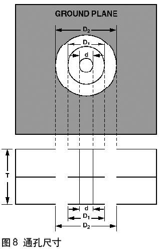 通孔是另外一種寄生源;它們能引起寄生電感和寄生電容。公式(3)是計(jì)算寄生電感的公式(參見圖8)。