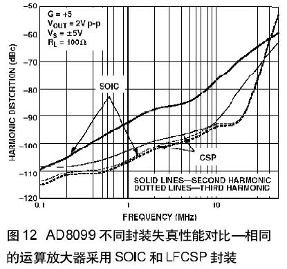 這種引腳排列還有一個好處就是降低了二次諧波失真。傳統(tǒng)運(yùn)算放大器的引腳配置中引起二次諧波失真的一個原因是同相輸入和負(fù)電源引腳之間的耦合作用。LFCSP封裝的低失真引腳排列消除了這種耦合所以極大地降低了二次諧波失真;在有些情況下多可降低14 dB。圖12示出了AD80992 采用SOIC封裝和LFCSP封裝失真性能的差別。