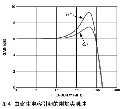 在高速電路中,很小的值就會影響電路的性能。有時候幾十個皮法(pF)的電容就足夠了。相關(guān)實(shí)例:如果在反相輸入端僅有1pF的附加寄生電容,它在頻率域可以引起差不多2dB的尖脈沖(見圖4)。如果寄生電容足夠大的話,它會引起電路的不穩(wěn)定和振蕩。