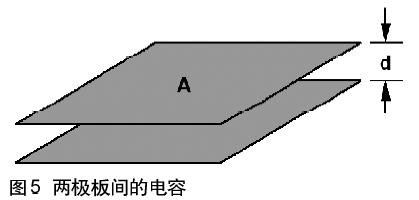 當(dāng)尋找有問題的寄生源時,可能用得著幾個計(jì)算上述那些寄生電容尺寸的基本公式。公式(1)是計(jì)算平行極板電容器(見圖5)的公式。
