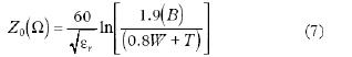 用于帶狀線的特征阻抗計(jì)算公式如公式(7)所示。