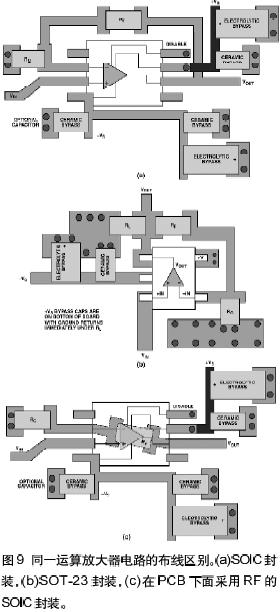圖9示出了采用SOIC封裝(a)和SOT-23封裝(b)的運(yùn)算放大器之間的布線區(qū)別。每種封裝都有它自身的一些問題。重點(diǎn)看(a),仔細(xì)觀察反饋路徑就發(fā)現(xiàn)有多種方法連接反饋。重要的是保證印制線長度短。反饋路徑中的寄生電感會引起振鈴和過沖。在圖9(a)和9(b)中,環(huán)繞放大器連接反饋路徑。圖9(c)示出了另外一種方法――在SOIC封裝下面連接反饋路徑――這樣就減小了反饋路徑的長度。每種方法都有細(xì)微的差別。一種方法會導(dǎo)致印制線過長,會增大串聯(lián)電感。二種方法采用了通孔,會引起寄生電容和寄生電感。在給PCB布線時必須要考慮這些寄生效應(yīng)的影響及其隱含的問題。SOT-23布線差幾乎是理想的:反饋印制線長度短,而且很少利用通孔;負(fù)載和旁路電容從很短的路徑返回到相同的地線連接;正電源端的電容(圖9(b)中未示出)直接放在PCB背面的負(fù)電源電容的下面。