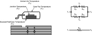 現(xiàn)在來(lái)快速了解一下如何進(jìn)行不含散熱片的簡(jiǎn)單PCB散熱設(shè)計(jì),圖3示意了模塊及作為熱阻抗的PCB。與從結(jié)到裸片焊盤的熱阻抗相比,由于結(jié)與外封裝頂部間的熱阻抗相對(duì)較高,因此在一次估計(jì)從結(jié)到周圍空氣的熱阻(θJT)時(shí),我們可以忽略θJA散熱路徑。
