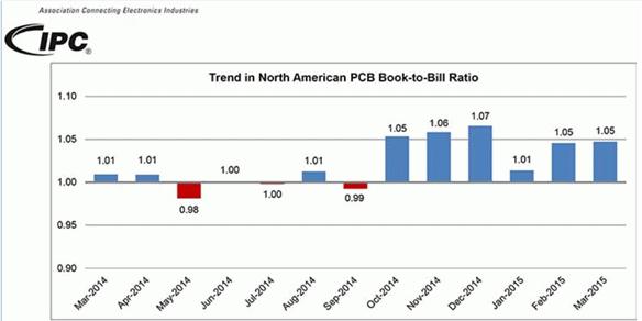2015年4月29日,美伊利諾伊州班諾克本 — IPC — 際電子工業(yè)聯(lián)接協(xié)會發(fā)布《3月份北美地區(qū)PCB行業(yè)調(diào)研統(tǒng)計報告》。報告顯示3月份銷售雖然低迷,但是訂單量超過去年同期水平,致使訂單出貨比穩(wěn)定在1.05。