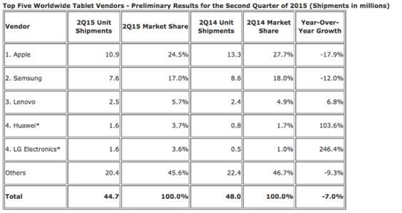 事實上不止蘋果,與一季度相比全球平板電腦出貨量繼續(xù)下滑4個百分點。IDC發(fā)布的二季度平板電腦銷量報告顯示,今年二季度全球平板電腦的出貨量為4470萬臺,較去年同期的4800萬臺縮減了7%。而包括屏幕較大的iPad和iPadMini在內(nèi),蘋果的平板電腦出貨量亦較早年同期下滑了26個百分點,至1090萬臺,市場份額為24.5%,仍舊位居一名。二名的三星出貨量為760萬臺,市場份額為17%。聯(lián)想位居三,出貨量為250萬臺,市場份額為5.7%。LG和華為并列四,出貨量均為160萬臺。
