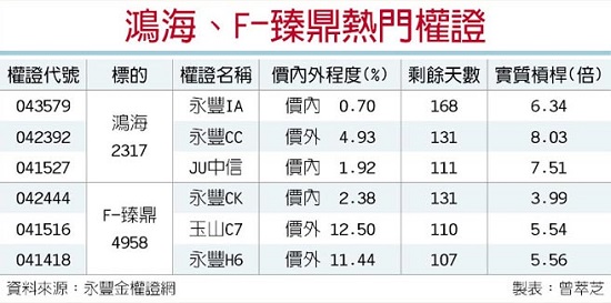 蘋果新機(jī)上市加持等利多浮現(xiàn),永豐金證衍商部指出,鴻家軍中的鴻海(2317)及F-臻鼎(4958)熱門認(rèn)購(gòu)權(quán)證很夯。
