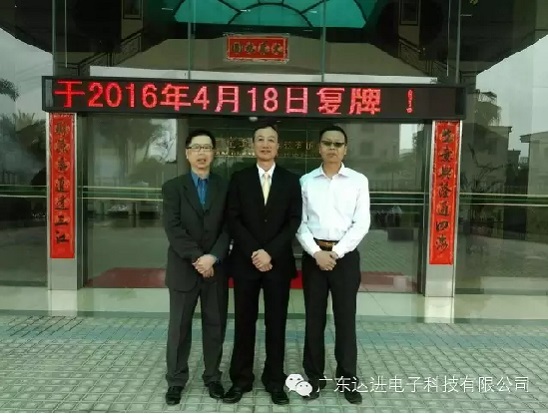 集團(tuán)公司董事總經(jīng)理黃永財(cái)先生、副總經(jīng)理張垂榮先生、總經(jīng)理助理曾擁光先生等管理層于18日早8:30帶領(lǐng)企業(yè)60多名管理人員在廣東達(dá)進(jìn)電子科技有限公司大堂慶賀:達(dá)進(jìn)東方照明控股有限公司香港股票【00515】于2016年4月18日復(fù)牌 ,并聽取黃總、張總的重要講話!