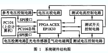測試過程是在上位計算機的控制下,控制測試電路分別打開不同的測試開關(guān)。測試機系統(tǒng)由以下幾部分構(gòu)成: 上位計算機PC104 、測試控制邏輯(由FPGA 實現(xiàn)) 、高壓測試電路。 其中上位機主要完成人機交互、測試算法、測試數(shù)據(jù)處理以及控制輸出等功能。 FPGA 控制高壓測試電路完成對PCB 的測試過程。