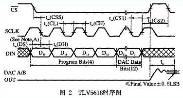 TLV5618是TI公司帶緩沖基準輸入(高阻抗)的雙路12 位電壓輸出DAC,通過CMOS 兼容的3線串行總線實現(xiàn)數(shù)字控制。器件接收16 位命令字,產(chǎn)生兩路D/A模擬輸出。TLV5618只有單一I/O周期,由外部時鐘SCL K決定,延續(xù)16 個時鐘周期,將命令字寫入片內(nèi)寄存器,完成后即進行D/A轉(zhuǎn)換。TLV5618讀入命令字是從CS的下降沿開始有效,從下一SCLK的下降沿開始讀入數(shù)據(jù),讀入16位數(shù)據(jù)后即進入轉(zhuǎn)換周期,直到下次出現(xiàn)CS的下降沿。 其操作時序圖如圖2 所示。