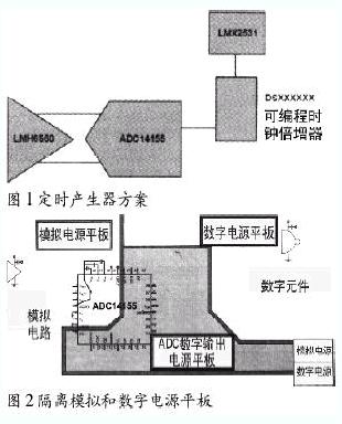 由于很多系統(tǒng)通過背板或另外連接分配參考時(shí)鐘,這會降低信號質(zhì)量,所以,通常用本機(jī)振蕩器(低相位噪聲的VCXD)做為ADC的定時(shí)源。圖1示出用NS公司的LMX2531時(shí)鐘合成實(shí)現(xiàn)定時(shí)產(chǎn)生。連接到定時(shí)產(chǎn)生器的LMX2531由可編程分頻器合成器輸出,給出小于100毫微微秒的抖動性能。