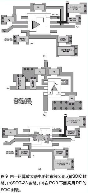 圖9示出了采用SOIC封裝(a)和SOT-23封裝(b)的運(yùn)算放大器之間的布線區(qū)別。每種封裝都有它自身的一些問題。重點(diǎn)看(a),仔細(xì)觀察反饋路徑就發(fā)現(xiàn)有多種方法連接反饋。重要的是保證印制線長(zhǎng)度短。反饋路徑中的寄生電感會(huì)引起振鈴和過沖。在圖9(a)和9(b)中,環(huán)繞放大器連接反饋路徑。圖9(c)示出了另外一種方法——在SOIC封裝下面連接反饋路徑——這樣就減小了反饋路徑的長(zhǎng)度。每種方法都有細(xì)微的差別。一種方法會(huì)導(dǎo)致印制線過長(zhǎng),會(huì)增大串聯(lián)電感。二種方法采用了通孔,會(huì)引起寄生電容和寄生電感。在給PCB布線時(shí)必須要考慮這些寄生效應(yīng)的影響及其隱含的問題。SOT-23布線差幾乎是理想的:反饋印制線長(zhǎng)度短,而且很少利用通孔;負(fù)載和旁路電容從很短的路徑返回到相同的地線連接;正電源端的電容(圖9(b)中未示出)直接放在PCB背面的負(fù)電源電容的下面。