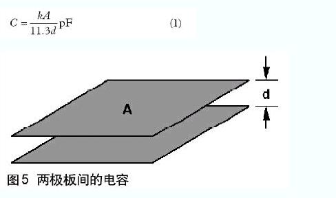 當尋找有問題的寄生源時,可能用得著幾個計算上述那些寄生電容尺寸的基本公式。公式(1)是計算平行極板電容器(見圖5)的公式。