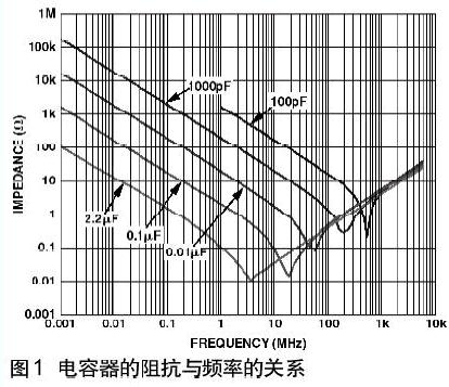 并聯(lián)不同的電容值的電容器有助于確保電源引腳在很寬的頻帶上只能看到很低的交流(AC)阻抗。這對于在運算放大器電源抑制比(PSR)衰減頻率處尤其重要。該電容器有助于補償放大器降低的PSR。在許多十倍頻程范圍內(nèi)保持低阻抗的接地通路將有助于確保有害的噪聲不能進入運算放大器。圖1示出了采用多個并聯(lián)電容器的優(yōu)點。在低頻段,大的電容器提供低阻抗的接地通路。但是一旦頻率達到了它們自身的諧振頻率,電容器的容性就會減弱,并且逐漸呈現(xiàn)出感性。這就是為什么采用多個電容器是很重要的原因:當一個電容器的頻率響應(yīng)開始下降時,另一個電容器的頻率響應(yīng)開始起作用,所以能在許多十倍頻程范圍內(nèi)保持很低的AC阻抗。