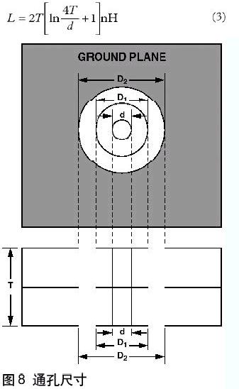 通孔是另外一種寄生源;它們能引起寄生電感和寄生電容。公式(3)是計算寄生電感的公式(參見圖8)。