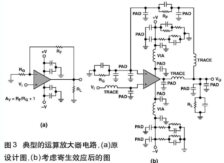 所謂寄生效應(yīng)就是那些溜進你的PCB并在電路中大施破壞、令人頭痛、原因不明的小故障。它們就是滲入高速電路中隱藏的寄生電容和寄生電感。其中包括由封裝引腳和印制線過長形成的寄生電感;焊盤到地、焊盤到電源平面和焊盤到印制線之間形成的寄生電容;通孔之間的相互影響,以及許多其它可能的寄生效應(yīng)。圖3(a)示出了一個典型的同相運算放大器原理圖。但是,如果考慮寄生效應(yīng)的話,同樣的電路可能會變成圖3(b)那樣。