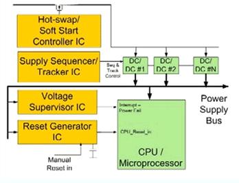 在本文中,電源管理被簡單定義為:對PCB上的全部電源實施管理(包括:DC-DC轉換器、LDO等)。電源管理包括如下功能:管理PCB上DC-DC控制器。例如,熱插拔、軟啟動、排序、追蹤、容限和規(guī)整;生成全部相關的電源狀態(tài)和控制邏輯信號。例如,復位信號生成、電源故障指示(監(jiān)控)和電壓管理。圖1演示了一個采用CPU或微處理器的PCB上的典型電源管理功能;熱插拔/軟啟動控制功能用于限制浪涌電流以減小電源的啟動負載。對插入有源(live)基板的PCB來說,這是個重要功能;電源排序和跟蹤功能用于在滿足PCB上的全部器件對上電順序要求的前提下,控制如何開/關多個電源。對所有電壓進行故障(過/欠壓)監(jiān)測以向處理器就即將發(fā)生的電源故障進行預警。該功能也被稱為“監(jiān)管功能”。