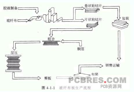 在覆銅板的生產(chǎn)流程中,一般包括:膠液制備、浸膠、粘結(jié)片貯存、組合、層壓、成品檢驗(含外部和內(nèi)部質(zhì)量檢驗)、剪切包裝等工序。具體見圖4-1-1 (以玻纖布板為例)。