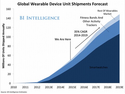 BI報(bào)告指出,穿戴設(shè)備未來幾年將迎來高增長期。預(yù)計(jì)在未來五年之內(nèi),全球穿戴設(shè)備的復(fù)合增長率將高達(dá)35%,到2019年的年銷量將達(dá)到近1.5億部。