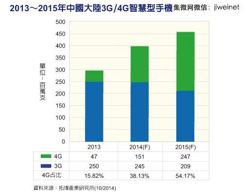 市場研究機(jī)構(gòu)拓墣產(chǎn)業(yè)研究所指出,隨著4G服務(wù)開通與4G晶片價格快速下滑,中大陸市場4G手機(jī)出貨量正強(qiáng)勁增長,預(yù)估2014年可達(dá)一億五千一百萬支;2015年更將正式超越3G手機(jī)出貨量,達(dá)到二億四千七百萬支規(guī)模,并占整體中智慧手機(jī)出貨量54.17%。