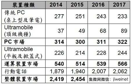 2014~2017年全球各類設(shè)備出貨量(單位:百萬(wàn)臺(tái))(來(lái)源:Gartner,2015年7月)