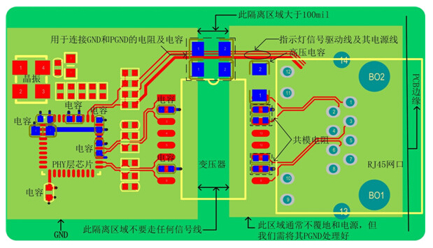 e) 變壓器的兩邊需要割地:即RJ45連接座和變壓器的次級線圈用單獨(dú)的隔離地,隔離區(qū)域100mil以上,且在這個(gè)隔離區(qū)域下沒有電源和地層存在。這樣做分割處理,就是為了達(dá)到初、次級的隔離,控制源端的干擾通過參考平面耦合到次級;
